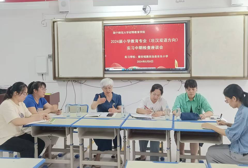 根据人才培养方案和教育实习计划安排,初学院壮汉双语系2021级小学教育专业(壮汉双语方向)37名专科学生2024年3月上旬至5月下旬分布在全区十余个项目学校开展教育实习活动。此次实习中期检查是实践教学的重要环节,顺利推进了学生实习工作,也为壮汉双语系今后的实践教学工作和人才培养方案的修订工作提供了宝贵的经验和启示。