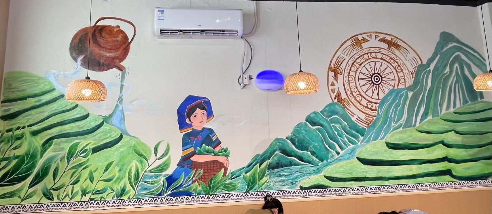 该项目负责人王艳芳老师、谢璧蔚老师和绘画组成员结合店内特色,有序开展以壮族文化为主题的墙绘活动。以店内两面2*3米墙为画卷,搭架作画精心设计;以丙烯、画笔为材料,一笔一划细心勾勒,打造当地一处新景观。整体墙面包含广西油茶、壮族少女、龙胜梯田、象鼻山、独秀峰、铜鼓等元素,既美化了店里环境,又呈现了壮族文化。