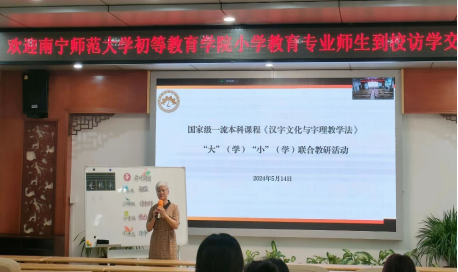 5月14日和5月15日,国家一流本科课程《汉字文化与字理教学法》“大(学)小(学)”联合教研暨2023级小学教育专业语文方向研究生《小学教学设计与实施(语文)》《汉字文化与字理教学法》课程实践活动,分别在南宁市凤翔路小学和南宁市五象新区第二实验小学举行。参加此项实践活动的主要人员为指导教师梁春莲老师、2023级小学教育专业24名语文方向和2名英语方向的学生。