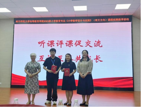 本次课程实践活动主要包含学生课堂演练、名师风采展示、小组合作研讨等。在学生课堂演练环节,同学们纷纷展示自己的教学技能和基本功,老师们依次进行点评,帮助同学们发现问题,解决问题,不断提高专业水平。在名师风采展示时,同学们聆听了南宁市凤翔路小学卢飞燕老师的现场课《荷叶圆圆》、南宁市五象新区第二实验小学张莉老师的研究课《十六年前的回忆》、南宁市五象新区第二实验小学莫烘霞书记《革命文化教育与语文教学》的讲座,南宁师大梁春莲教授《立足三个维度、彰显革命文化题材教学的特性》的讲座。在小组合作研讨环节,南宁市凤翔路小学语文团队教研组以《荷叶圆圆 夏日研研 乐趣融融》为主题,向同学们分享了团队研修成果,教师间积极交流,促进思维碰撞。