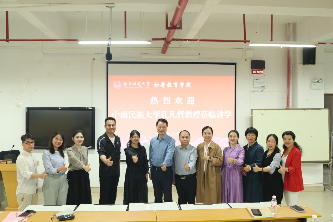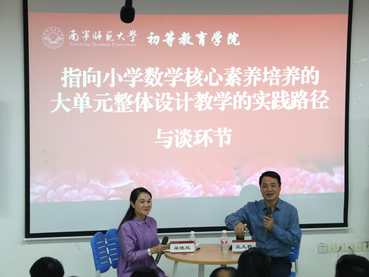 特邀中南民族大学孔凡哲教授到校作《指向核心素养培养的小学数学单元整体教学的实践路径》学术讲座。讲座由学院副院长卢锦珍教授主持,200多名师生以及南宁市20多位小学数学教师参与。