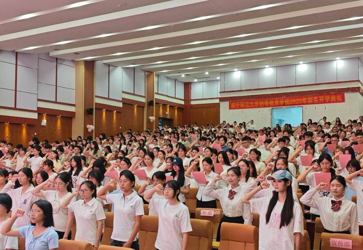 随后,2025级全科1班林伊带领全体新生进行小学教育专业师范生入学宣誓。最后,典礼在校歌声中顺利落幕。