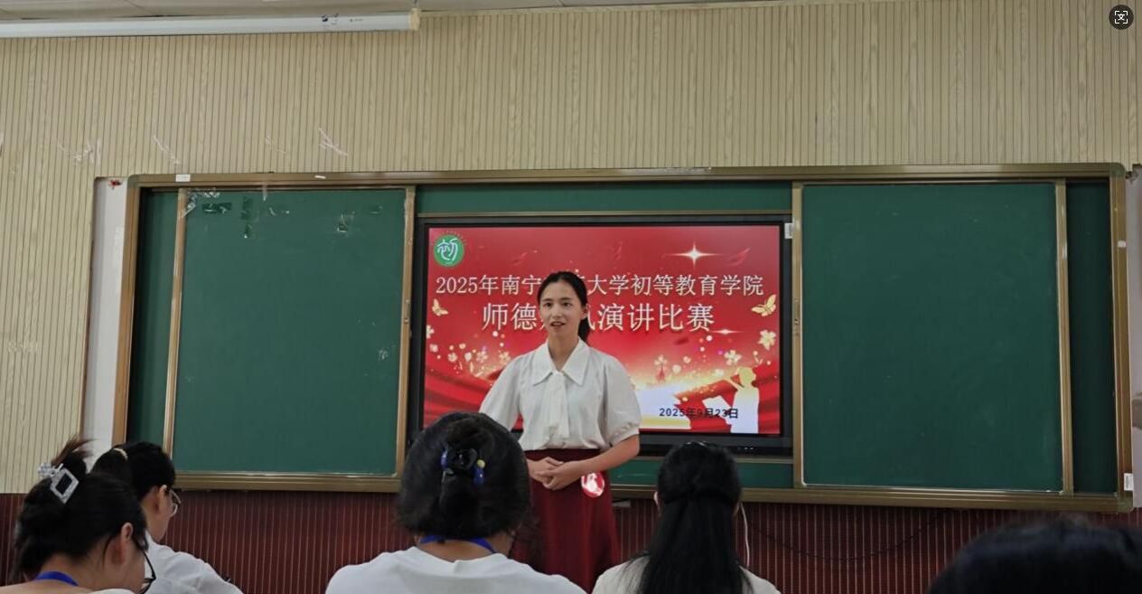 于9月23日下午在五合校区理综楼803教室举行2025年师范生师德师风演讲比赛。学院党委书记陆以宏,学院辅导员李露露,学院学生代表参加本次活动。学院综合教研室主任刘冬梅,全国模范教师、学院教师梁晓红,学院全科壮语系副主任韦宵爱担任本次比赛评委。