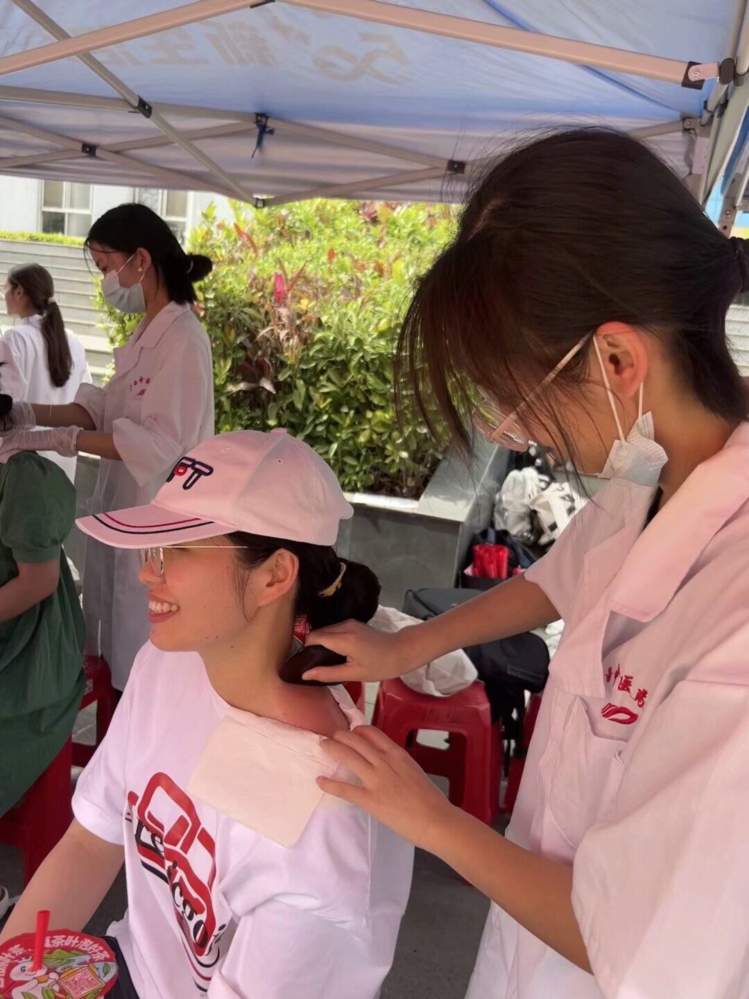 的师生们提供了手法按摩、量血压、艾灸、刮痧等多种健康志愿服务。活动现场气氛热烈,前来参与活动的师生络绎不绝,其中也包含一部分来自东南亚国家的留学生。师生们在享受健康志愿服务的同时,也对中医药文化及健康知识有了更深入的了解。
