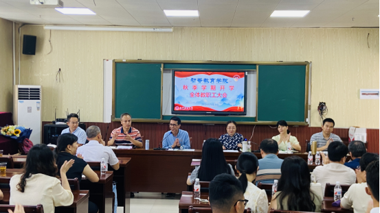 梁宇院长首先向全体教职工介绍了入职教师宣布了小学教育研究中心主任、语文教研室主任等院内岗位的人员调整随后,党委苏学权副书记学院今年毕业生就业、暑期“三下乡”社会实践活动、新生录取和报道入学等作了通报和小结,对新生班主任、新学期五合校区劳动基地建设等工作作了布置和安排,鼓励各位老师在黾勉完成本职工作的同时积极参与劳动基地建设,充分利用劳动基地的平台和学生开展各类丰富的活动,加强师生联系。卢锦珍副院长总结了上半年学院获科研立项和优秀科研成果,鼓励学院的老师们充分发挥各自的专业所长,以老带新,积极整合科研力量,持续推进教师个人科研能力和学院整体科研水平能力稳步提高;卢副院长还对新学期研究生的实习、毕业论文指导、研究生参赛、以及新入学研究生见面会等相关工作进行了具体安排。梁秀清副院长总结了原教育学院并入后,五合和建政两校区资源整合情况,并提出了新学期要通过安排教师培训和开展教研活动等提高教师队伍的综合素养;同时对小学教育人才培养方案的修订工作、本学期本专科学生教学、实习以及毕业生论文指导等工作作了部署何聪党委组织员在下半年的党建工作计划中,分别从加强党员完善学习制度,提升基层党支部能力和水平,加强党员教育管理和监督以及推进党建先锋业务等方面进行了工作要求。