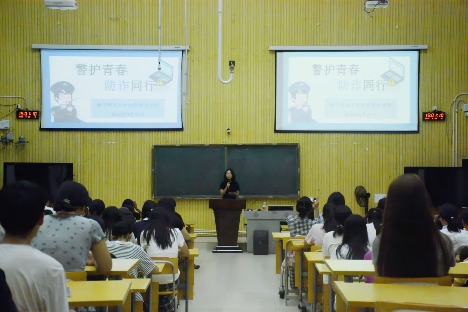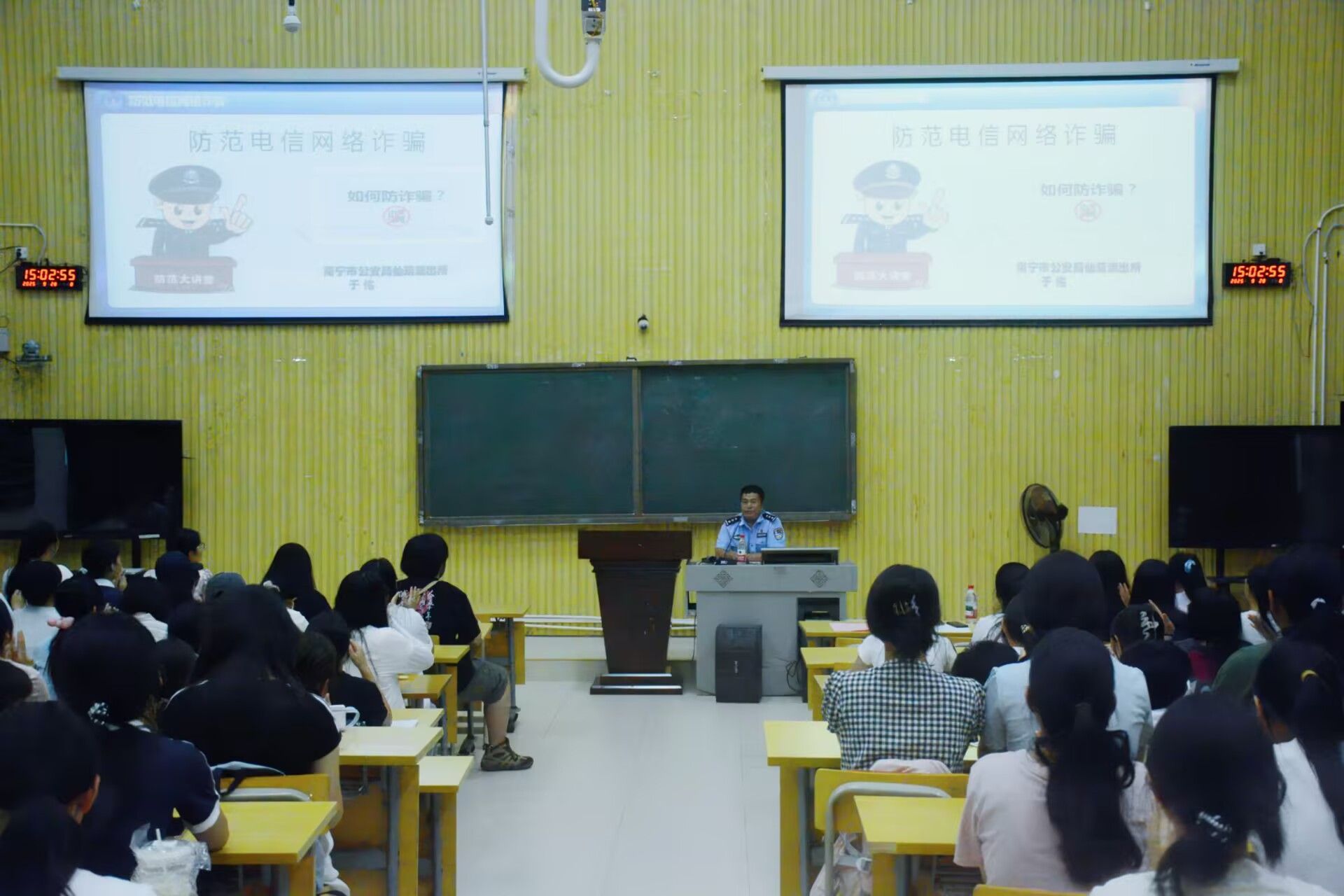 于9月28日下午在五合校区五综楼107教室开展反诈宣传活动。本次活动特邀南宁市公安局仙葫派出所民警于佑主讲,学院辅导员覃诗雅及2025级新生共同参与。