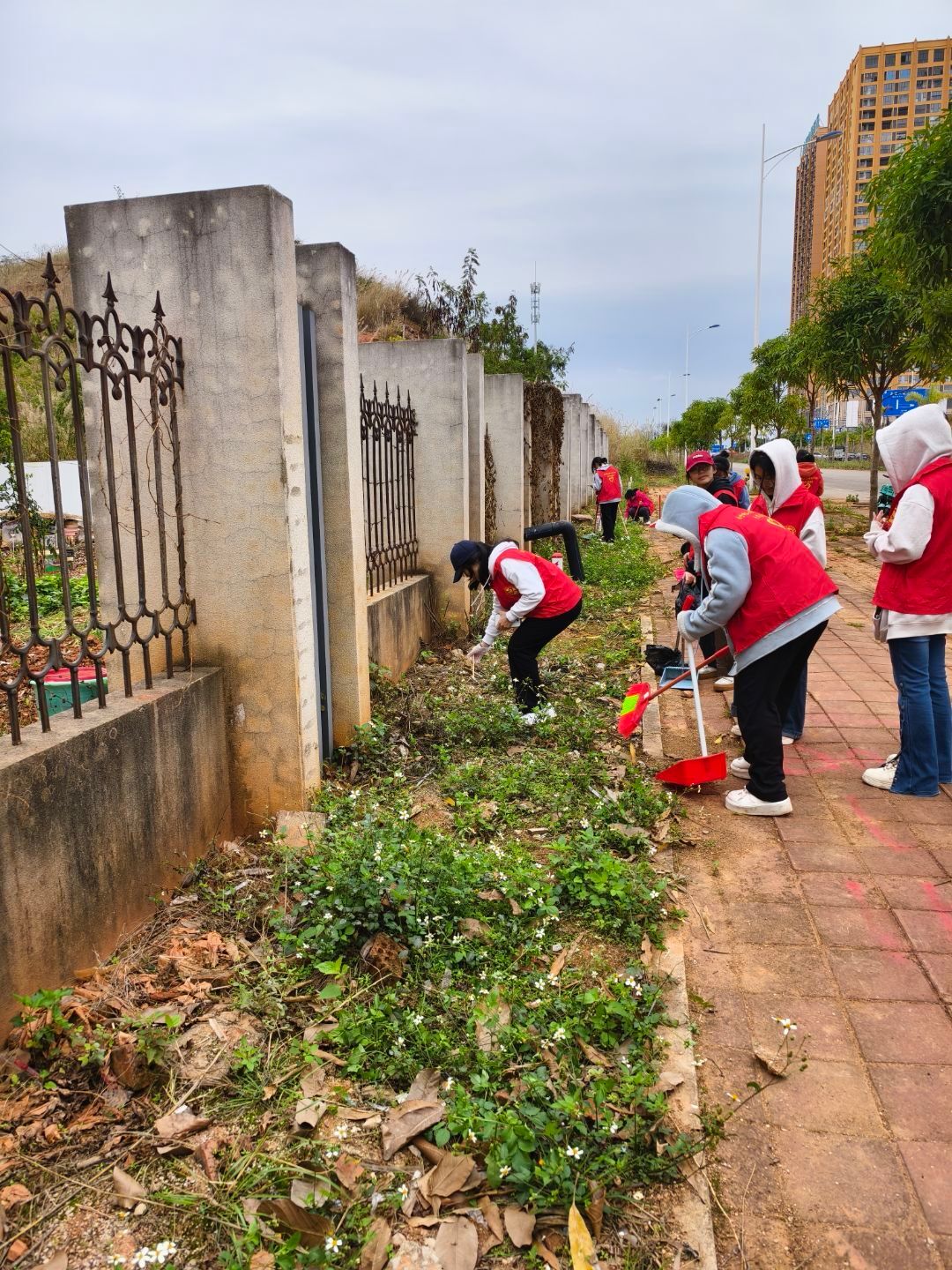 活动现场,志愿者们身着统一着装,个个精神抖擞,热情高涨。领取清扫工具后,大家分工协作,有条不紊地开始清扫工作。有的志愿者用扫帚仔细地将落叶扫成一堆,再用簸箕装进垃圾袋;有的志愿者则弯下身子,用夹子夹起隐藏在草丛中的竹签、塑料袋等垃圾;还有的志愿者主动承担起搬运垃圾的重任,一趟趟将装满垃圾的袋子运送到指定地点。在清扫过程中,大家互帮互助,充分展现了团结友爱的团队精神。期间,志愿者们还积极结合实际,与过往同学宣传环保知识,倡导大家爱护环境,养成良好的卫生习惯。经过一个半小时的辛勤努力,学校西门周边街道旧貌换新颜,变得干净整洁。