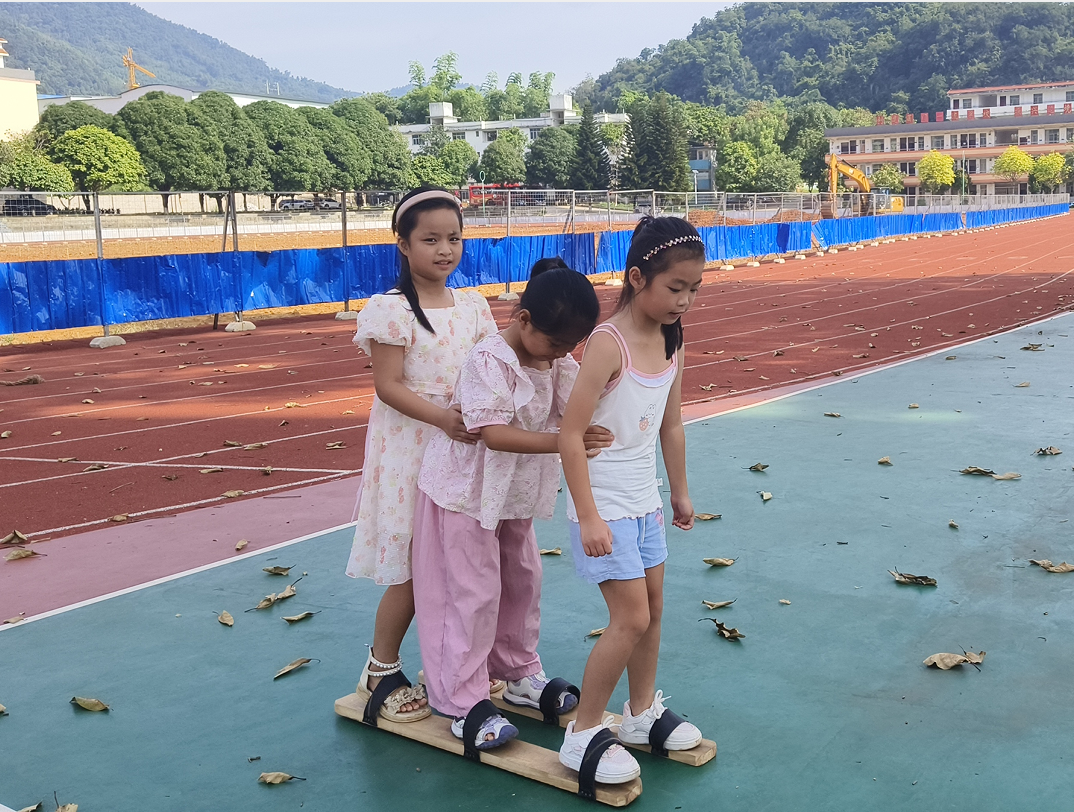 本次运动会将传统民俗与现代趣味相结合,设置了多个特色竞技项目,既有考验协作能力的纸板运乒乓球、背夹气球,也有锻炼精细动作的筷夹乒乓球,还有展现团队默契的长绳集体跳和富有民族特色的三人板鞋。活动中,孩子们与实践队员们分组竞技,在纸板运乒乓球项目中巧妙传递、默契配合;三人板鞋比赛里,大家喊着口号同步前行,加油声、欢笑声此起彼伏,整个校园洋溢着欢乐的氛围。
