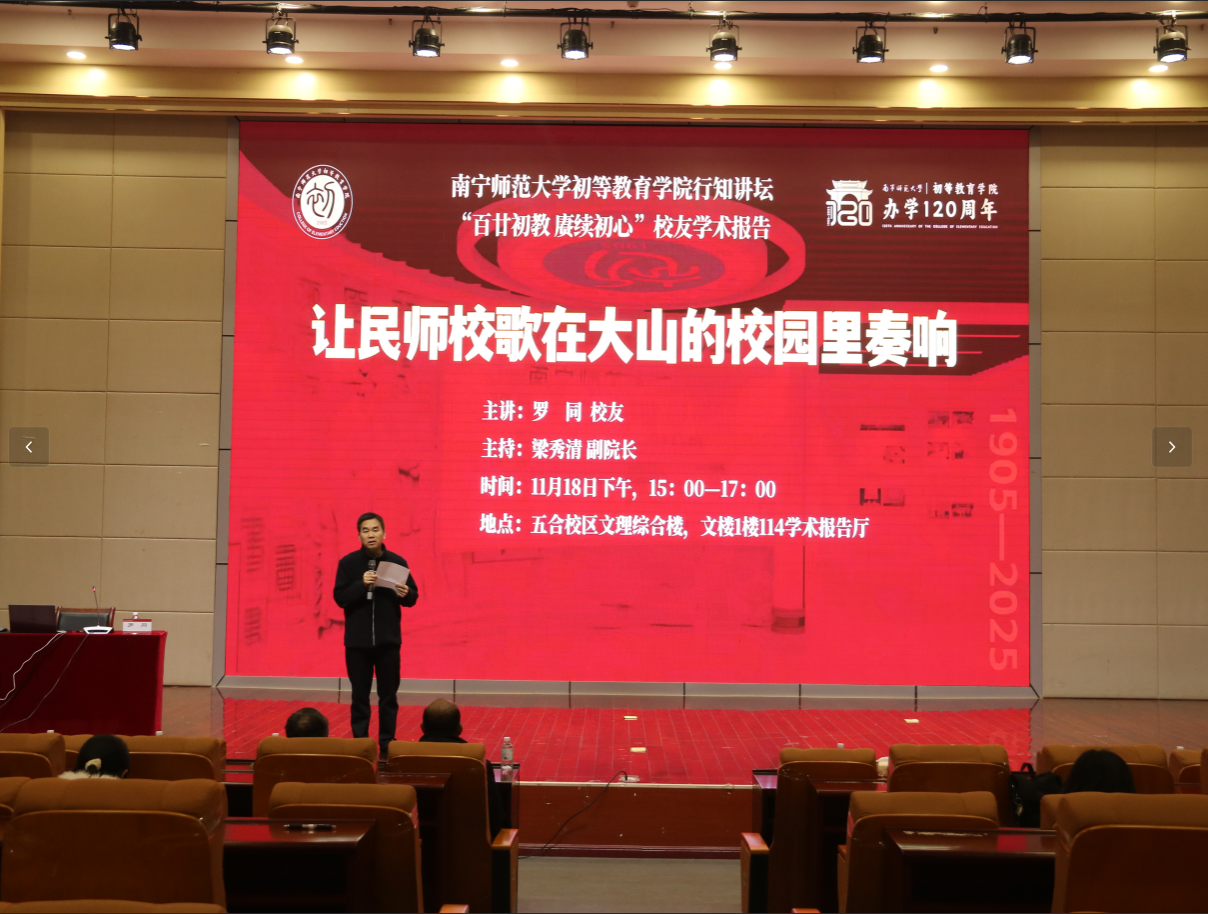 在五合校区文楼114报告厅举办“百廿初教 赓续初心”校友系列报告第六讲。本次报告特邀学院1986级校友、正高级教师罗同主讲,原广西南宁民族师范学校校长韦编贤老校长莅临会场,华人色情
